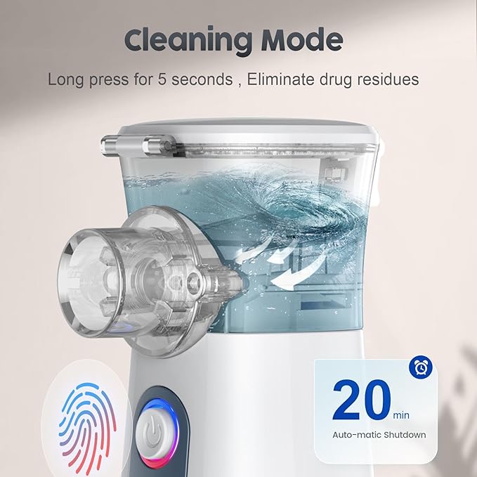 • ✅ Inhaler Machine for Adults and Kids - The mesh mist machine has Self-Cleaning Mode. Long press 5s to turn on the self-cleaning mode(all three lights are on), which can be used for daily cleaning to avoid clogging.